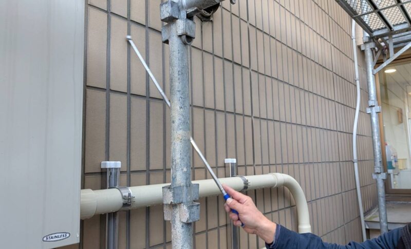 工事に先立ち外壁の打診調査を行いました。打音診断棒を外壁に滑らすと外壁タイルが浮いている箇所は音が高くなります。タイルの浮きを放置しておくと雨漏りの原因になりますし、外壁落下で第三者災害も考えられます。そのため、職人さんに1枚1枚丁寧に調査してもらい、浮きのあった場所にはマーキングを行い、写真や図面に落とし込みました。この後は調査報告書を作成して、施主様へご説明し、外壁の張り替えに移ります。色々な天候から建物を守ってくれる外壁の役割の重要性を知って頂き、永く施設が保たれるよう私たちも一生懸命頑張ります!