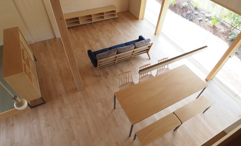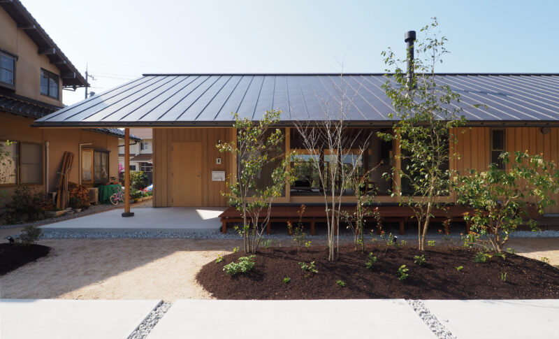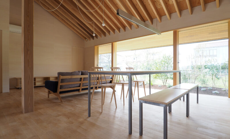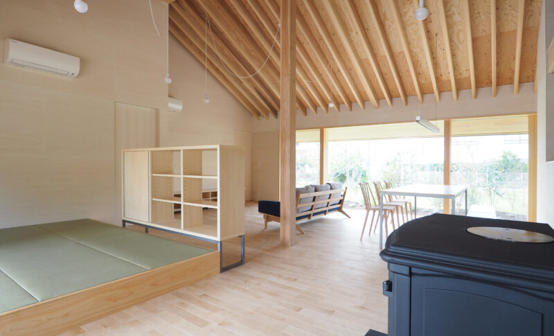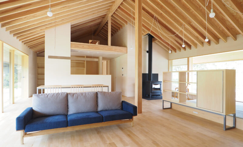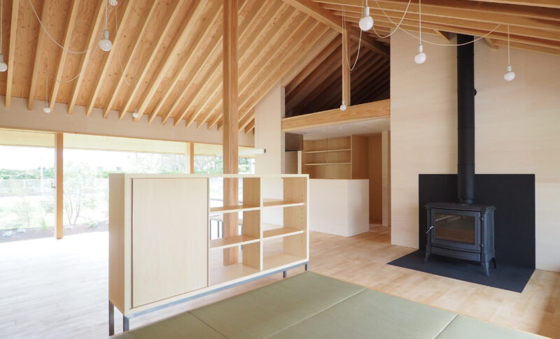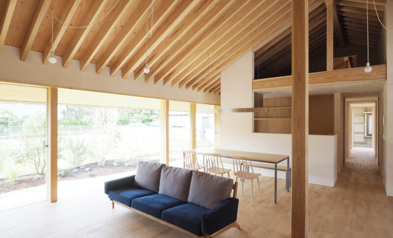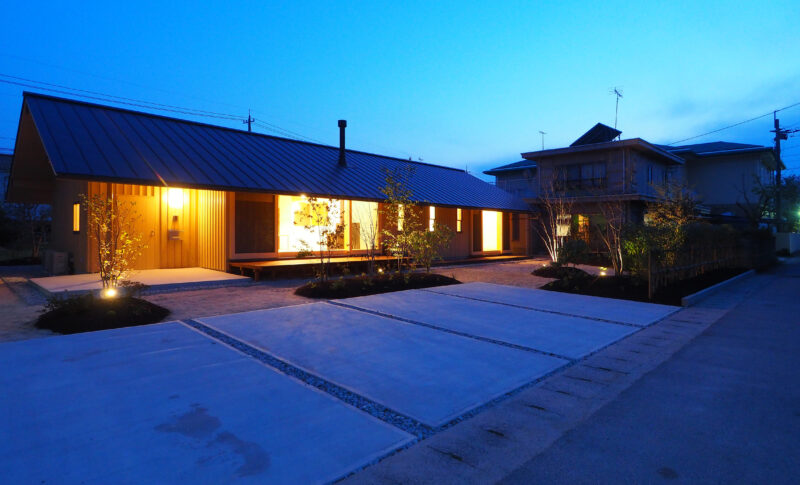 深い軒のある特徴的な外観。昼と夜、それぞれに魅力的な「顔」を魅せてくれます。室内は切妻屋根を生かした吹抜けに。まるで2階建のような開放感を感じる事ができます。木の優しい雰囲気が開放感がありつつも、落ち着いた空間にしています。