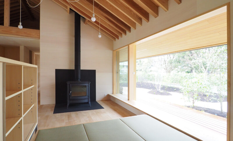 薪ストーブの存在が縁側の美しさと居心地の良さをより一層引き立てます。冬の寒い時期も窓辺でゆっくりとくつろぐ事ができます。