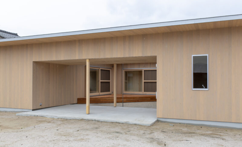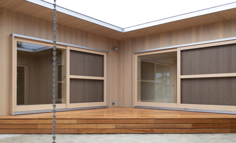 中庭は前面道路から地続きにつながり、外壁のラインにある柱、屋根のかかった軒下空間、中庭に敷設したセメントレンガなど、私的空間が緩やかに確保されるよう計画。 また、”コ”の字型のプランに対して45度で斜めに室内の床を貼ることと合わせ、中庭に三角形のデッキをつくることで、家族の私的空間である、室内と中庭の一体感が協調されるように設計されています。