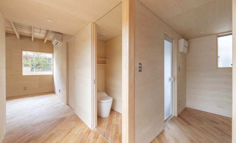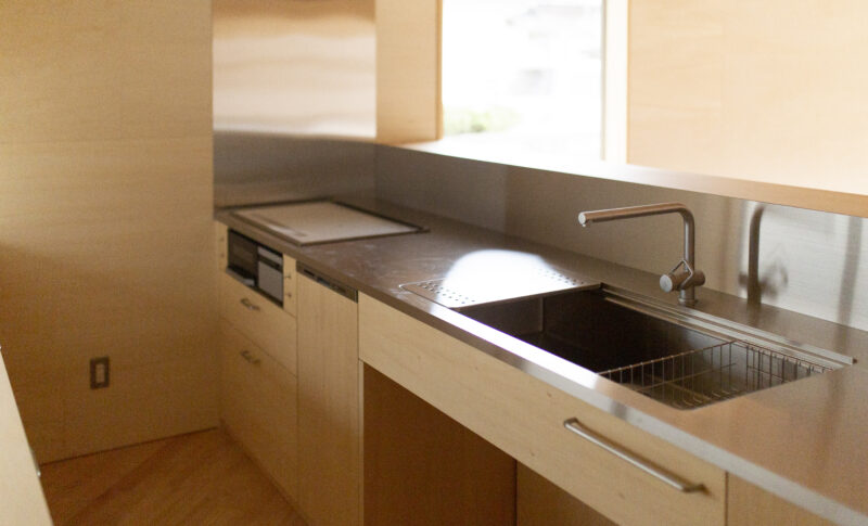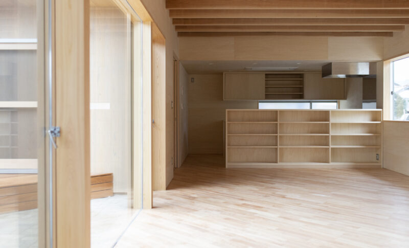 敷地は東側の前面道路、南北は狭い道を挟んで2階建てと3階建ての住宅に囲まれており、建築にあたってプライバシーの確保も重要な課題でした。敷地面積にはゆとりがあったため、平屋+中庭のプランを採用。中庭を中心に、リビングや各居室を“コ”の字型に配置し、外部からの視線をやわらかく遮りながら、家の中では開放的に過ごすことができます。