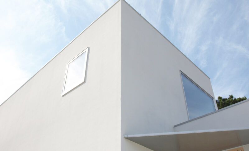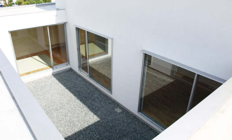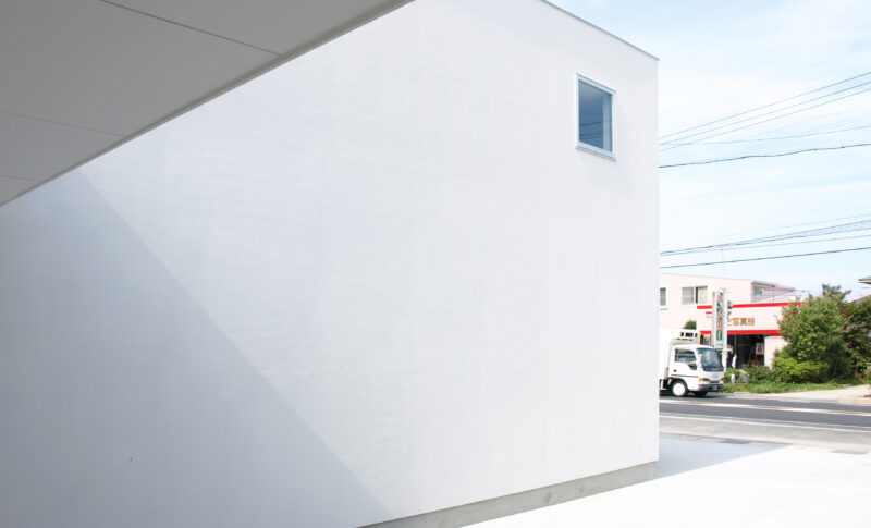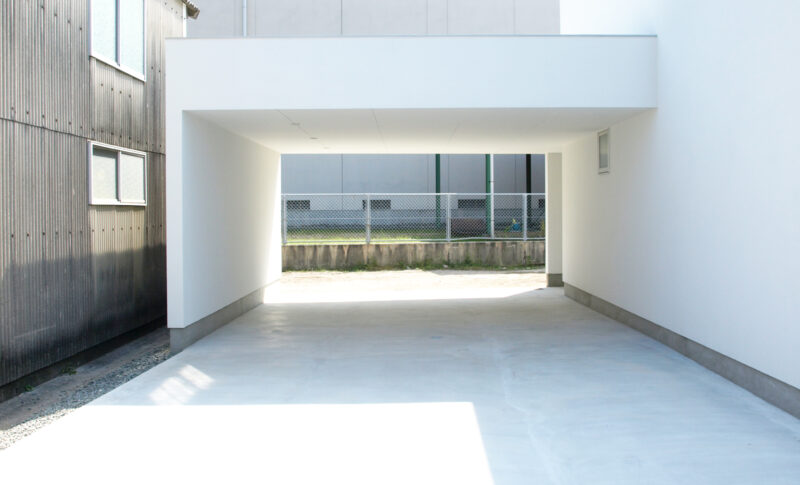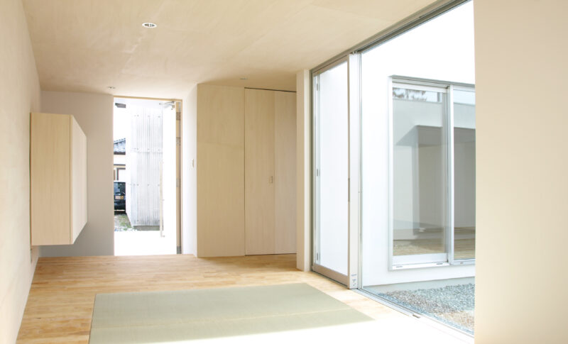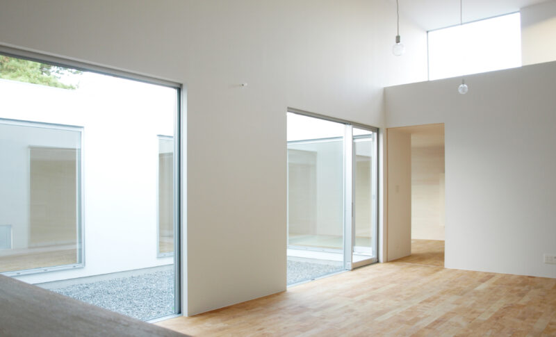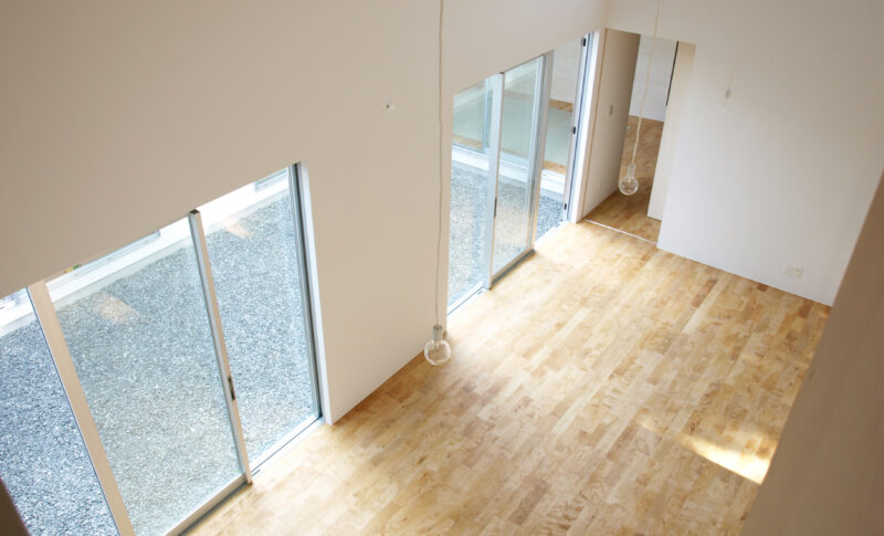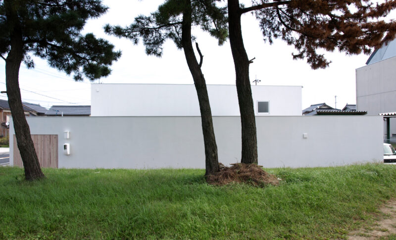 中学校のグラウンドや体育館、そして車通りの多い国道に囲まれた敷地。立地条件の中で、外からの視線や車の音を気にせず、安心して過ごせるコートハウスの施工を担当しました。