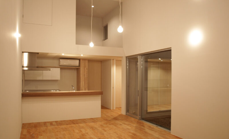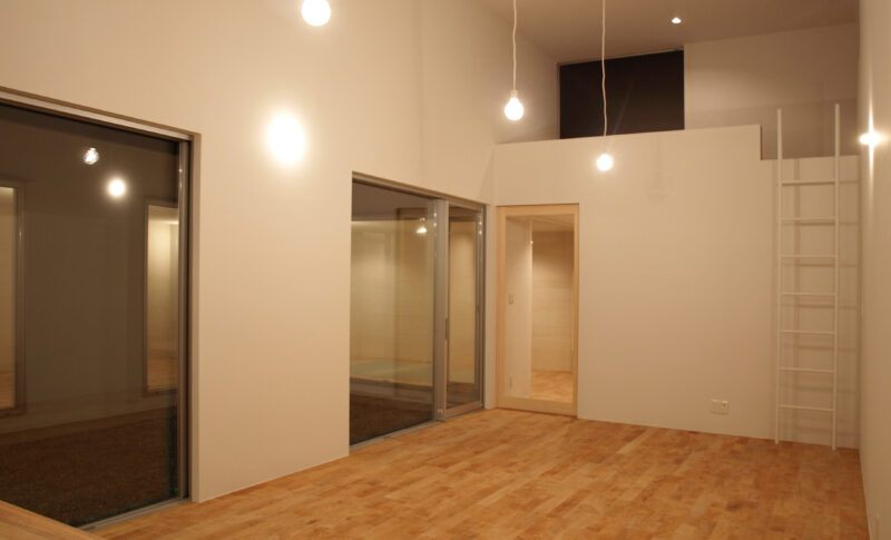 室内は、シンプルかつ圧迫感のない空間構成。内装にはシナ合板を使用し、貼り方に変化を持たせることで、単純な四角い部屋以上に広がりを感じられる空間に仕上げました。